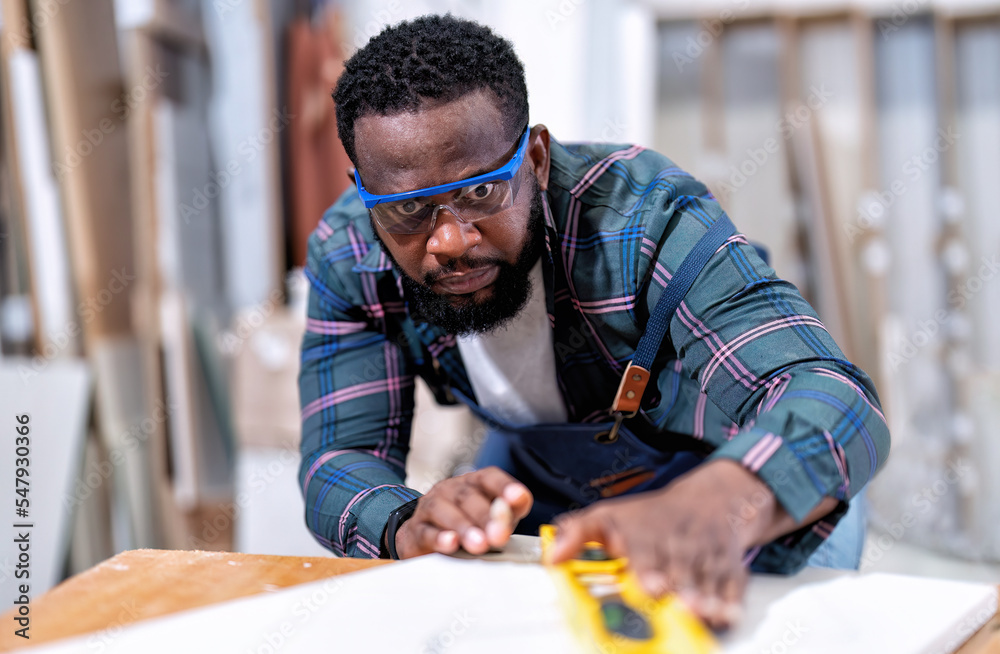 In work place carpenter man concentrate on ruler pencil draw alignment and drilling wood work