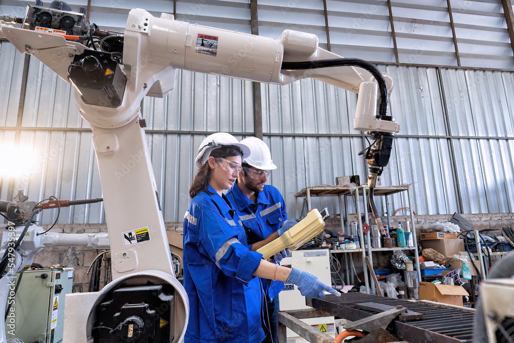 In robotic training center instructor use tablet pc teach girl engineer how to program robot arm