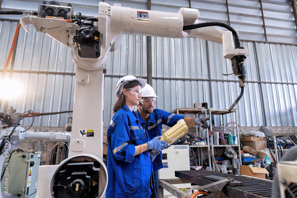 In robotic training center instructor use tablet pc teach girl engineer how to program robot arm
