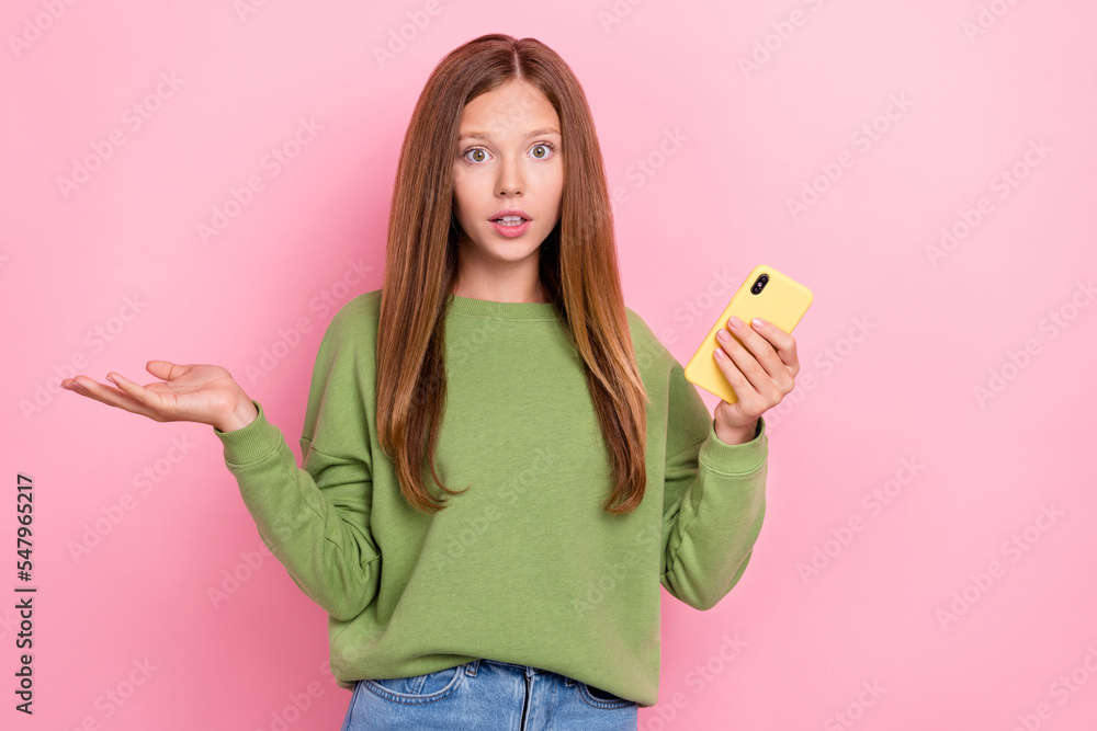 Portrait of adorable confused cute girl with long hairstyle dressed green sweatshirt hold smartphone isolated on pink color background