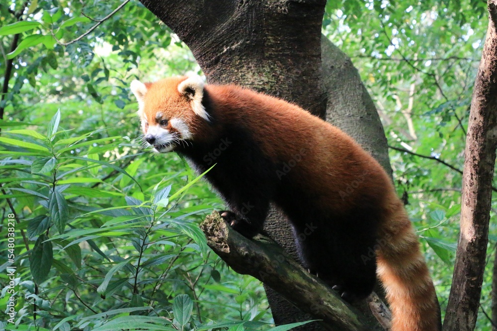 Close-up shot of a red panda on a tree