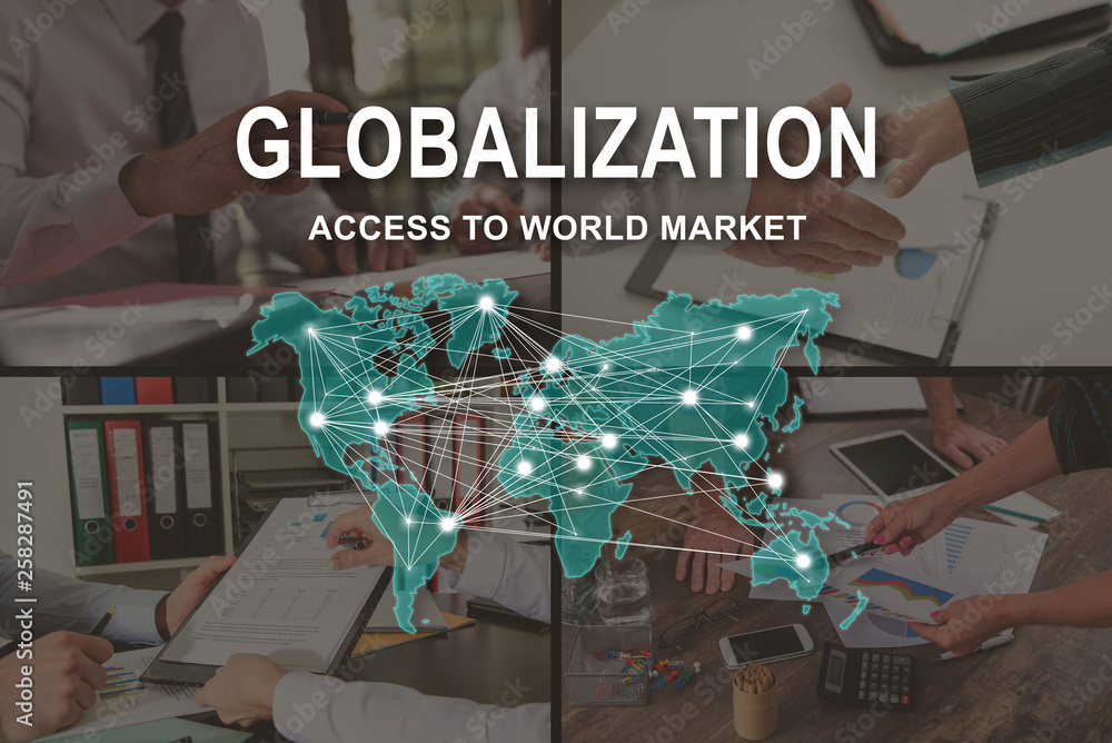 Double exposure of graphic America map hologram on Chicago office buildings background, big data and digital technology concept