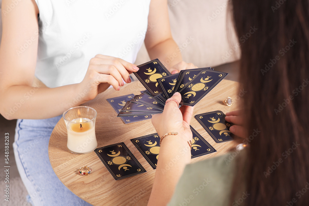 Woman pulling one tarot card at table indoors, closeup. Fortune telling