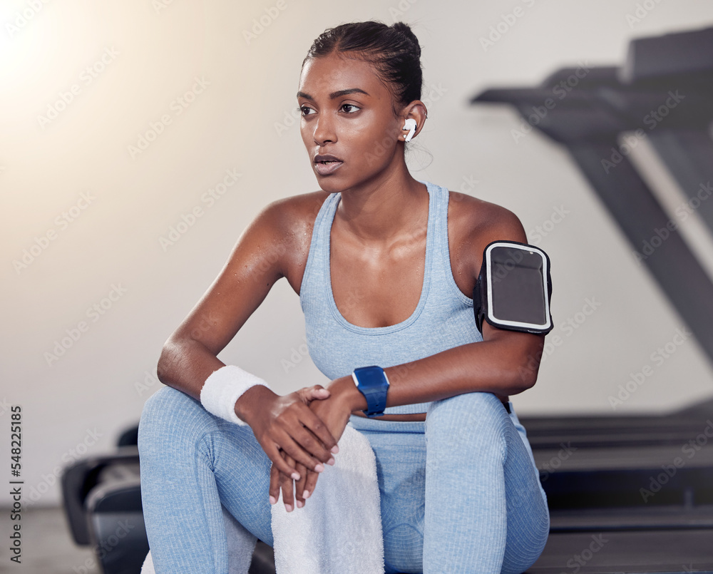 Fitness, woman and break in sweat from running exercise, cardio workout or training on treadmill at the gym. Tired female relaxing after intense exercising sport run for healthy breathing or wellness