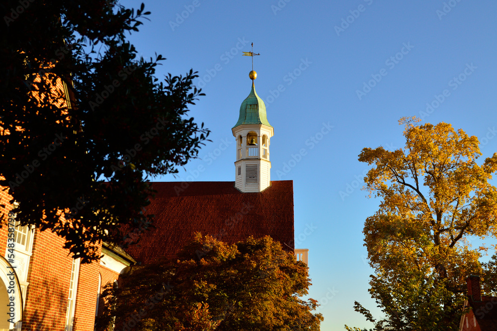 Beautiful Moravian church bell tower and autumn trees at sunset