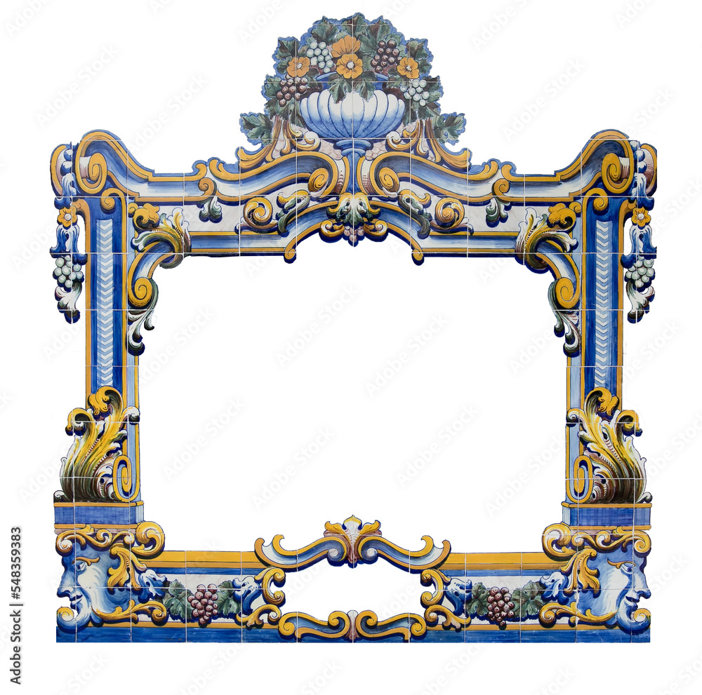 Traditional Portuguese decorative ceramic tiles. Elaborate ornate frame with placeholder for caption.