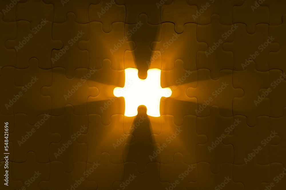 Sun light rays shining through hole from a missing piece of jigsaw puzzle.