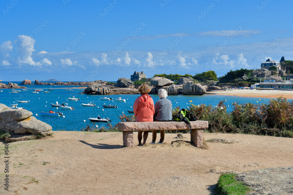 Deux personnes assises sur un banc face à la mer à Trégastel en Bretagne