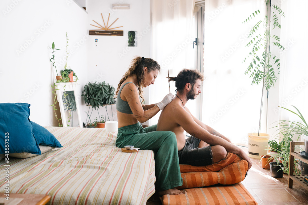 Woman Tattoo artist tattooing a back with handpoke technique in a natural indoor enviroment full of plants relaxed position sitting in a couch