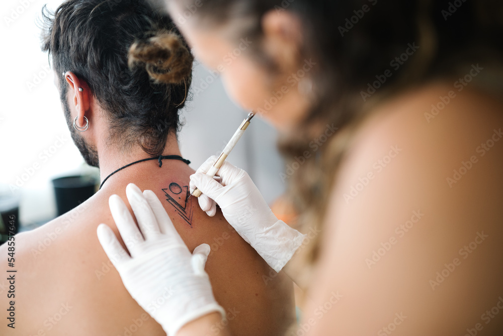 Handpoke tattoo technique minimalist design. detail handpoke Young woman tattoing with Handpoke tattoo technique the back of a young alternative man with handmade tattoo minimalist design