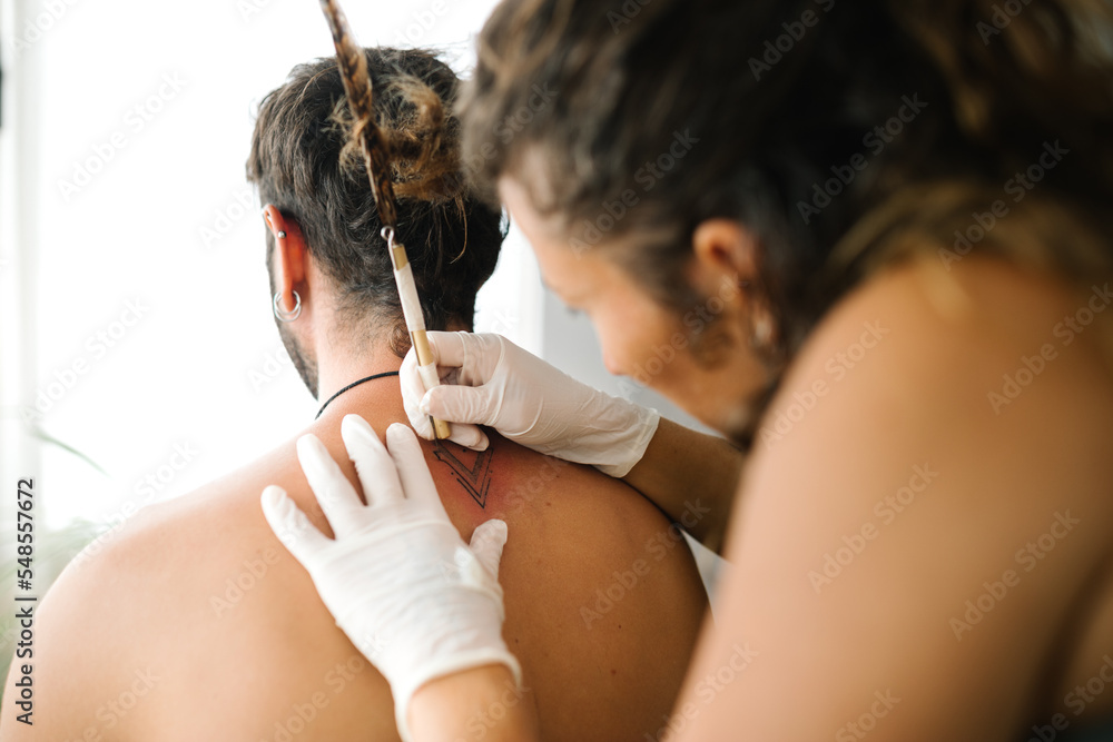 Handpoke tattoo technique minimalist design. detail handpoke Young woman tattoing with Handpoke tattoo technique the back of a young alternative man with handmade tattoo minimalist design