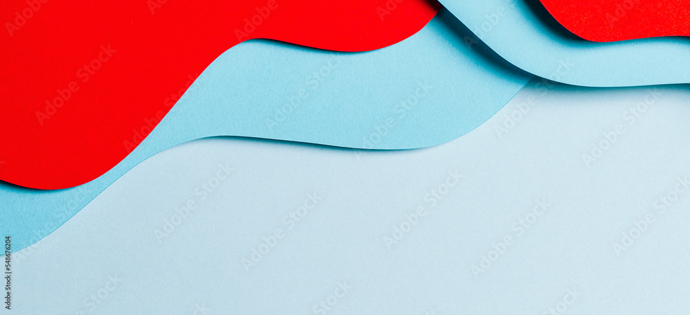 Abstract colored paper texture background. Minimal paper cut style composition with layers of geometric shapes and lines in red and light blue colors. Top view