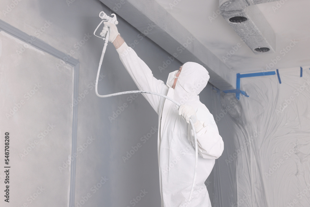 Decorator dyeing wall in grey color with spray paint indoors