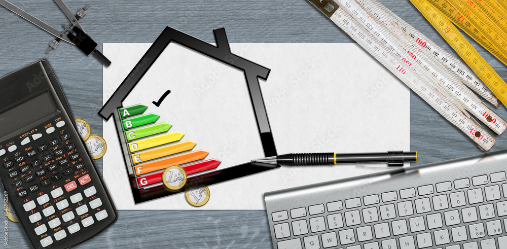 House energy efficiency rating. Small black model house on desk with energy efficiency graph, calculator, folding ruler, drawing compass, pencil and a computer keyboard and copy space.