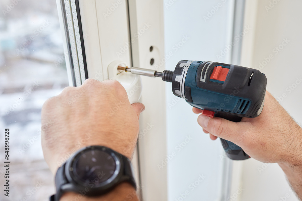 woman adjusting white pvc plastic balcony window door indoors. female using screwdriver to repair upvc window lock. house doors and windows maintenance concept. draft fixing conceptual.