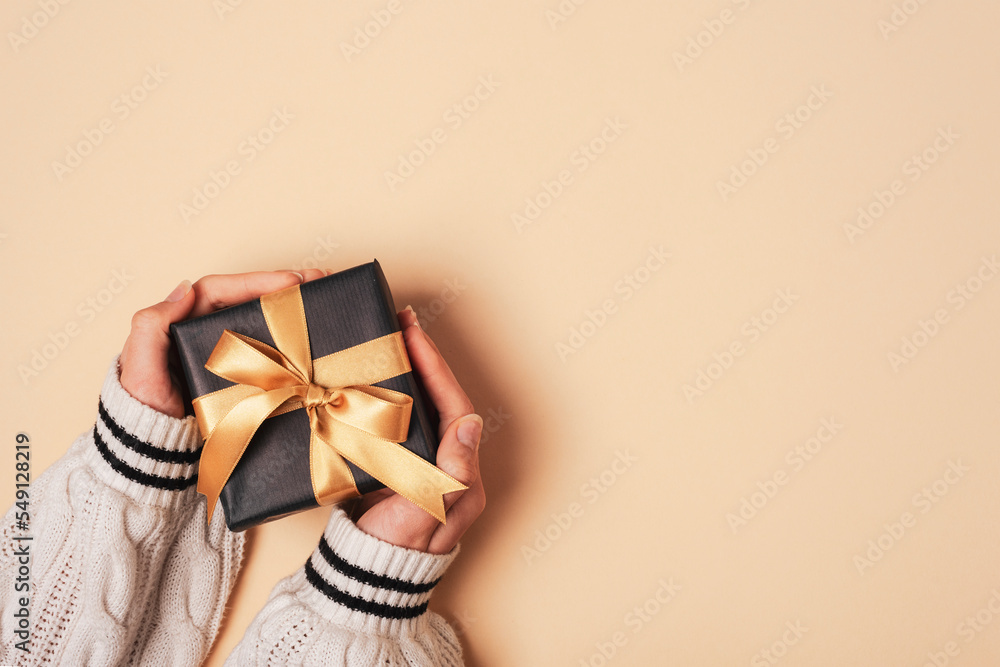 Girl's hands in white sweater holding black gift box with golden bow on neutral beige background. Christmas, Valentines day, Black friday sale concept. Top view, flat lay, copy space