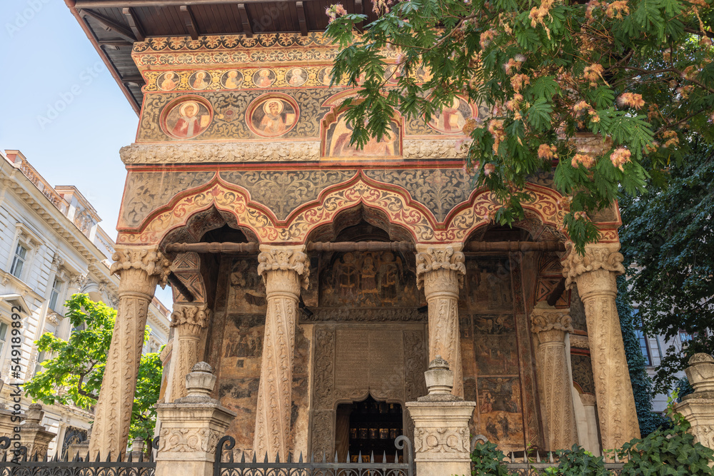 In remarkable Stavropoleos Church you admire the intricately carved wooden doors, carved sophisticated marble columns, saints painted on medalions and rails with griffins, Bucharest, Romania