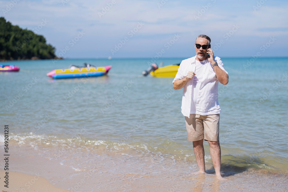Business man on holiday walk along the beach but continue work use mobile phone call to team