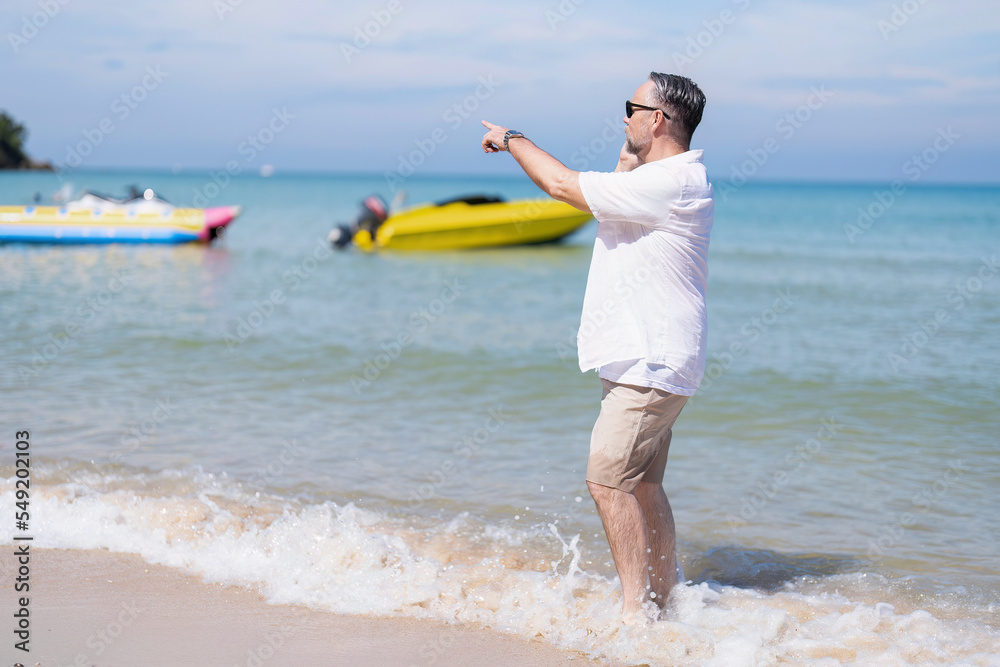 Business man on holiday walk along the beach but continue work use mobile phone call to team
