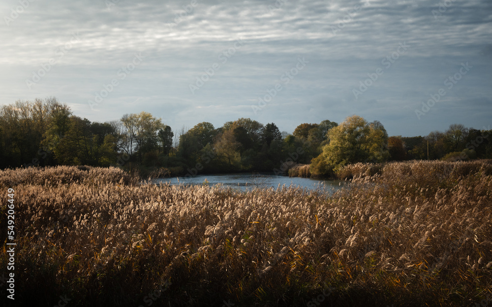 Reeds along Lesum and Wümme river (side rivers of Weser) near Wasserhorst (Bremen) on a dramatic clouded autumn day. Willows, grey clouded sky and water.