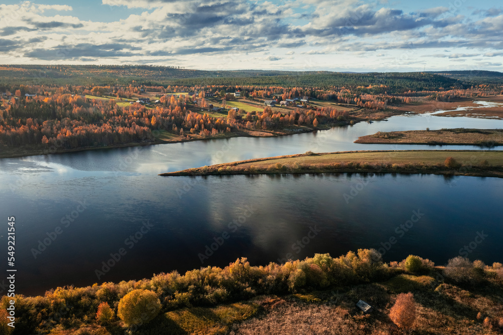 River with trees in autumn shades and a small village with wooden cottages on its banks