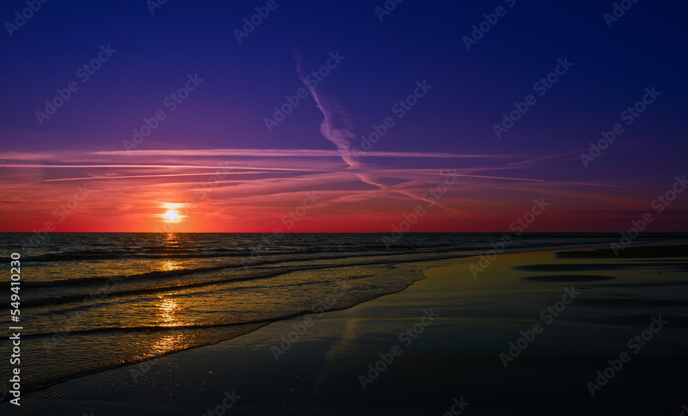 Sonnenuntergang am Sandstrand von Huisduinen-Den Helder in der niederländischen Provinz Nordholland