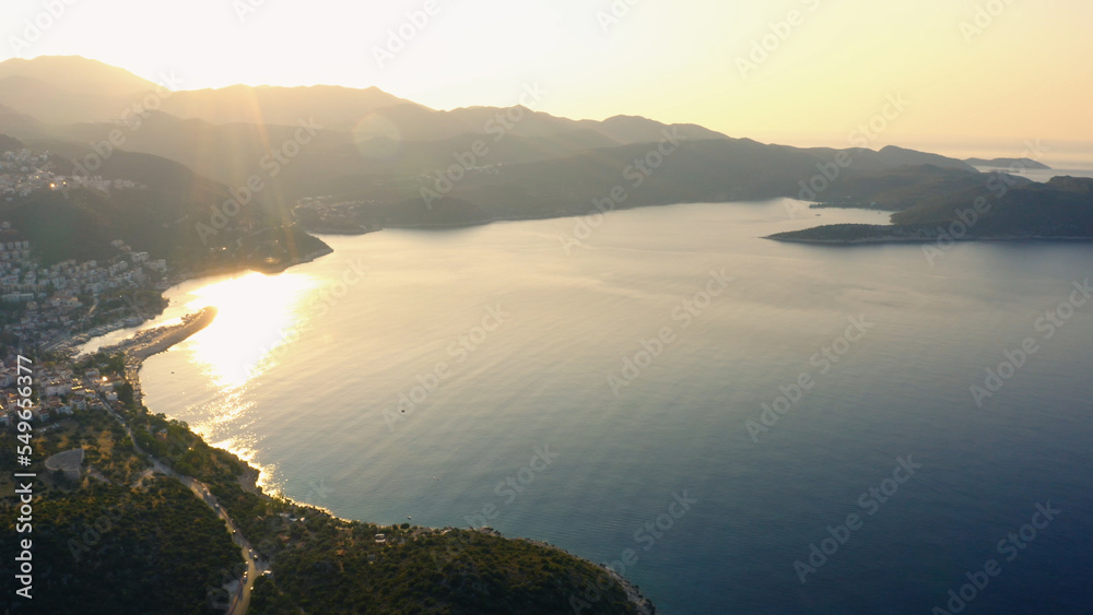 Panorama of sea bay in the morning. Resort town from above. Picturesque nature landscape.