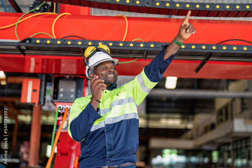 Engineer working quality check with hardware robotic arm at workshop Industry and radio to team