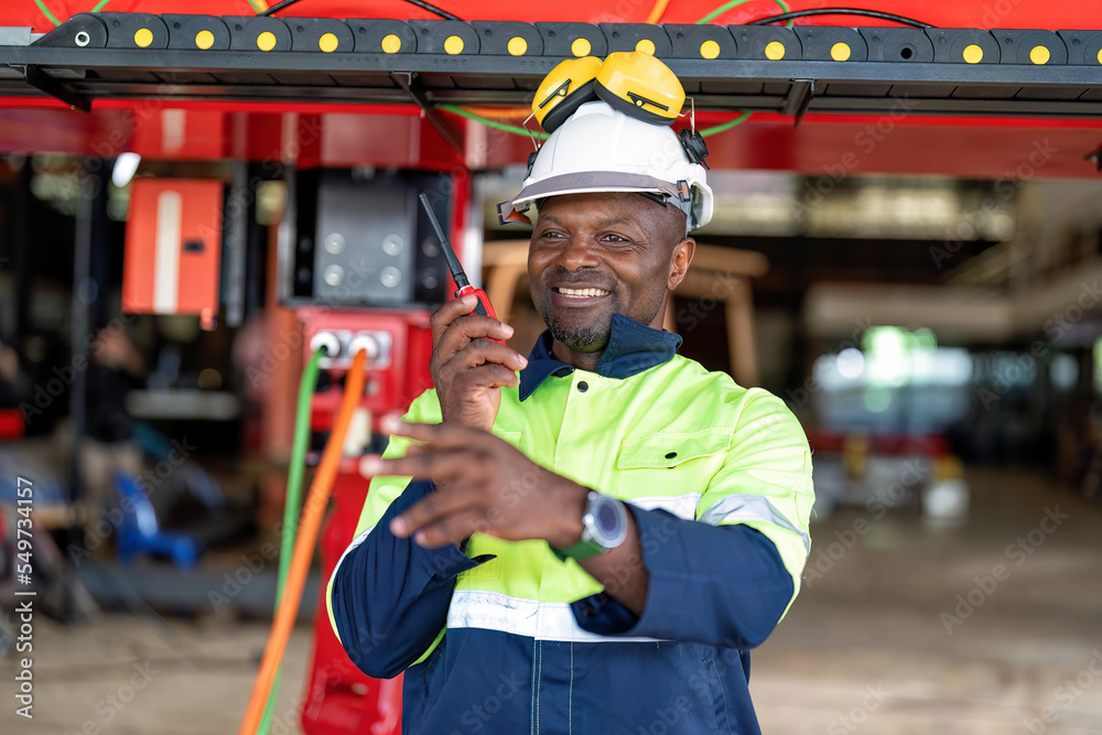 Engineer working quality check with hardware robotic arm at workshop Industry and radio to team
