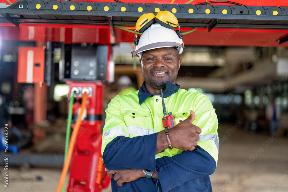 Engineer working quality check with hardware robotic arm at workshop Industry and radio to team