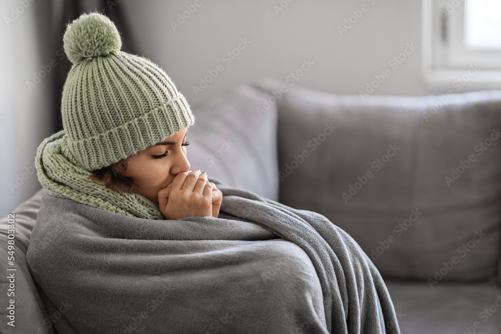 Freezing Woman Warming Hands With Breath While Sitting On Couch At Home