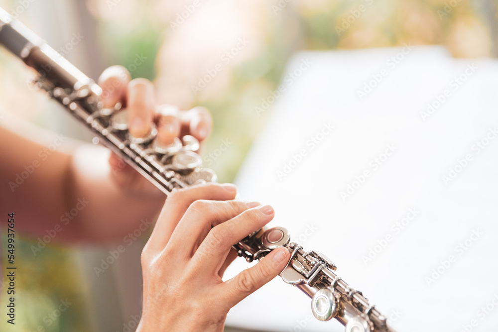 Flute : A closeup of hands of a musician playing the flute, detail shot, classical music, wind instrument performance player up close abstract..