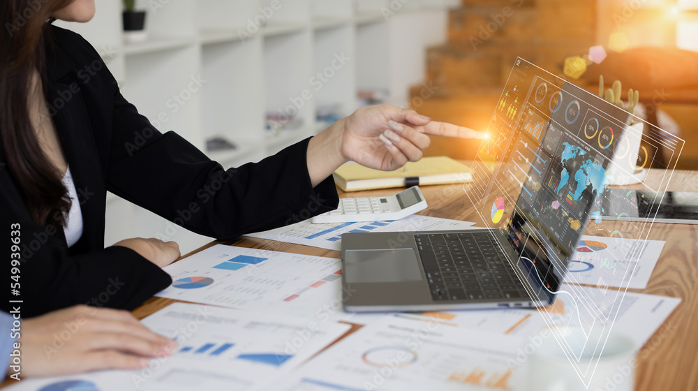 Technology and financial advisory services concert. Business teamwork and working on digital laptop computer with advisor showing plan of investment to clients at table office. Digital marketing.