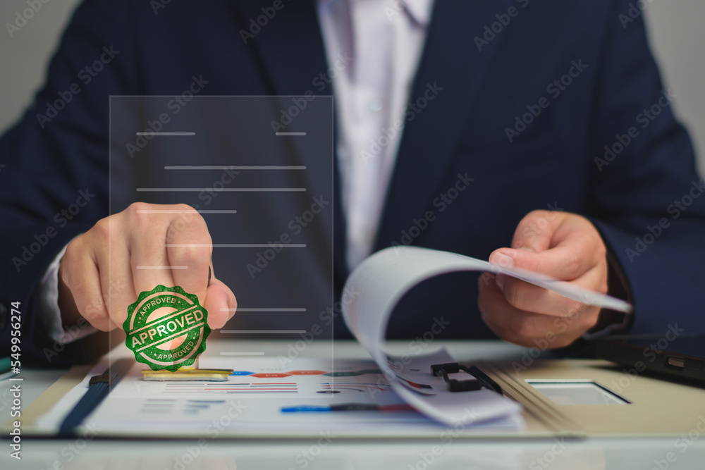 Business approved concept. Manager hand stamping with approved stamp on certificate document public paper, investment certificate, business document, certificate approved, investment allowed.