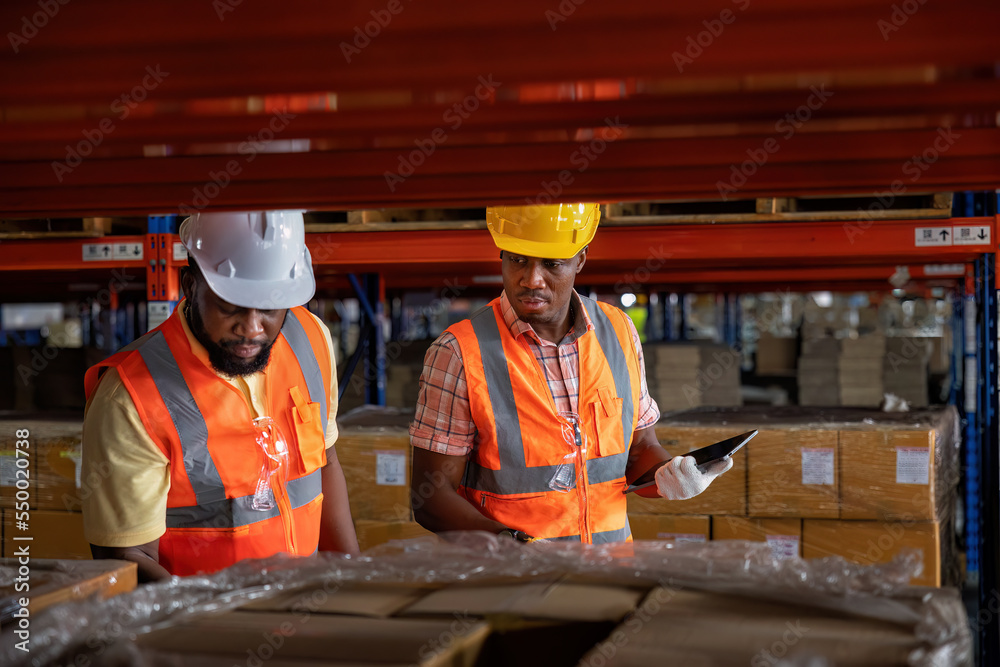 Foreman and worker in warehouse checking carton box barcode store at steel shelf ready to deliver