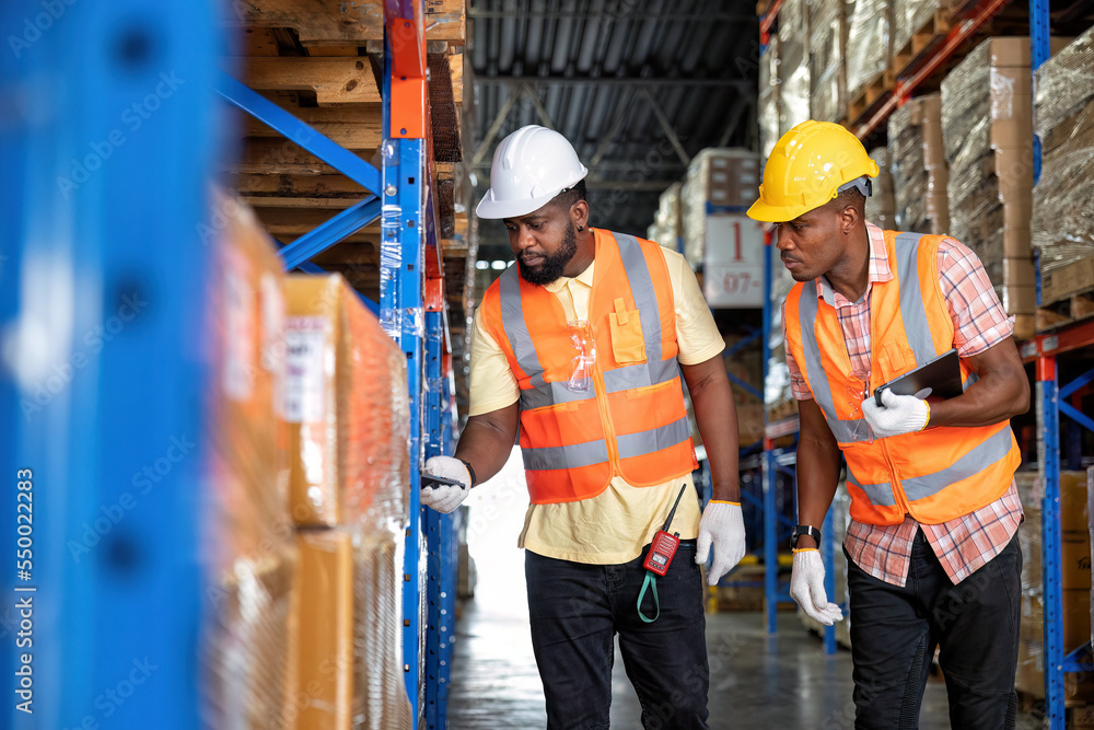 Foreman and worker in warehouse checking carton box barcode store at steel shelf ready to deliver