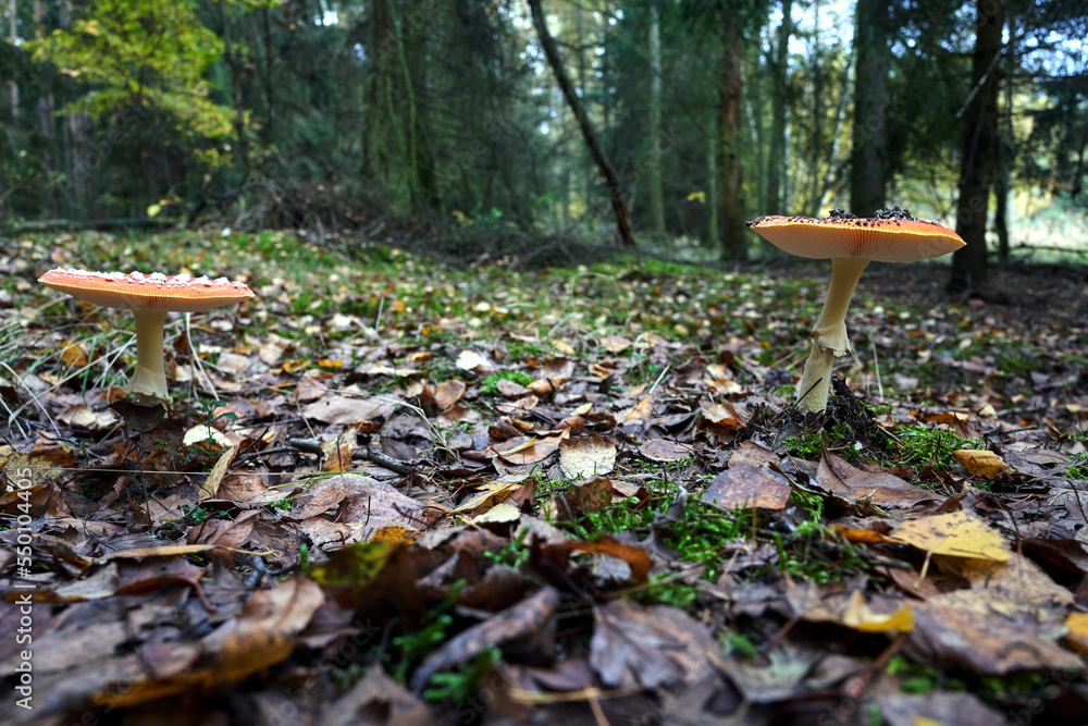 details of lamellar, inedible fungus among moss and fallen leaves in a forest during autumn
