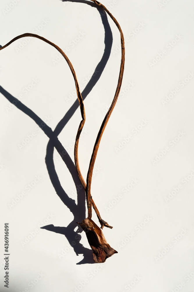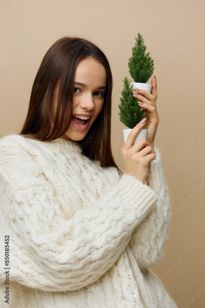 a cute, pretty woman is standing sideways on a light brown background and posing in a white knitted sweater, holding two small artificial Christmas trees in her hands, lifting one above the other