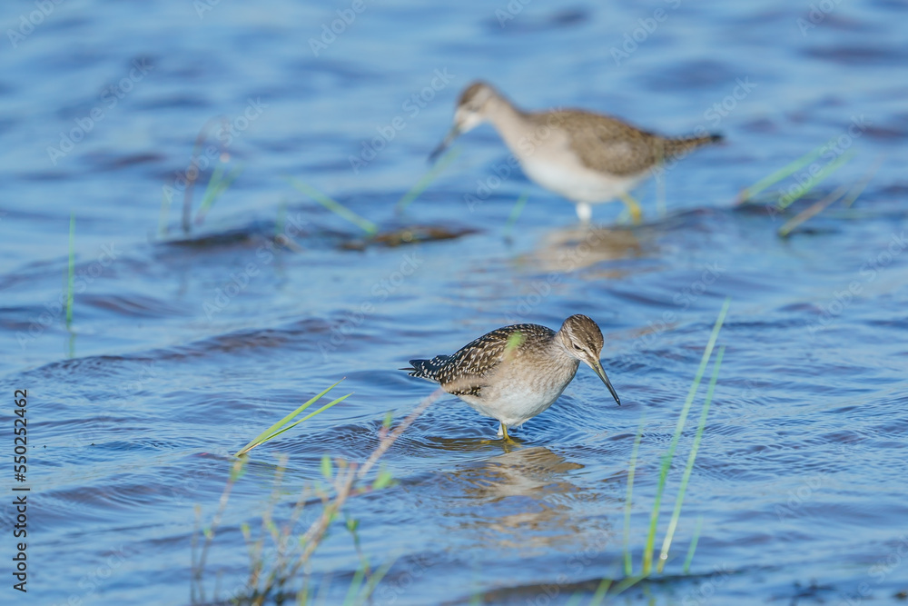 Wood Sandpiper (Tringa glareola) feeding in the lake