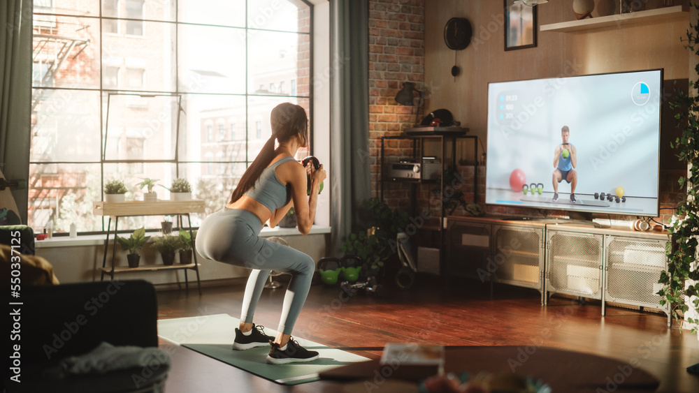 Home Gym: Asian Girl Training Using Kettlebell, Exercising with Personal Trainer via TV Online Video App. Authentic Woman Using Workout Service Fitness Streaming App for Virtual Training