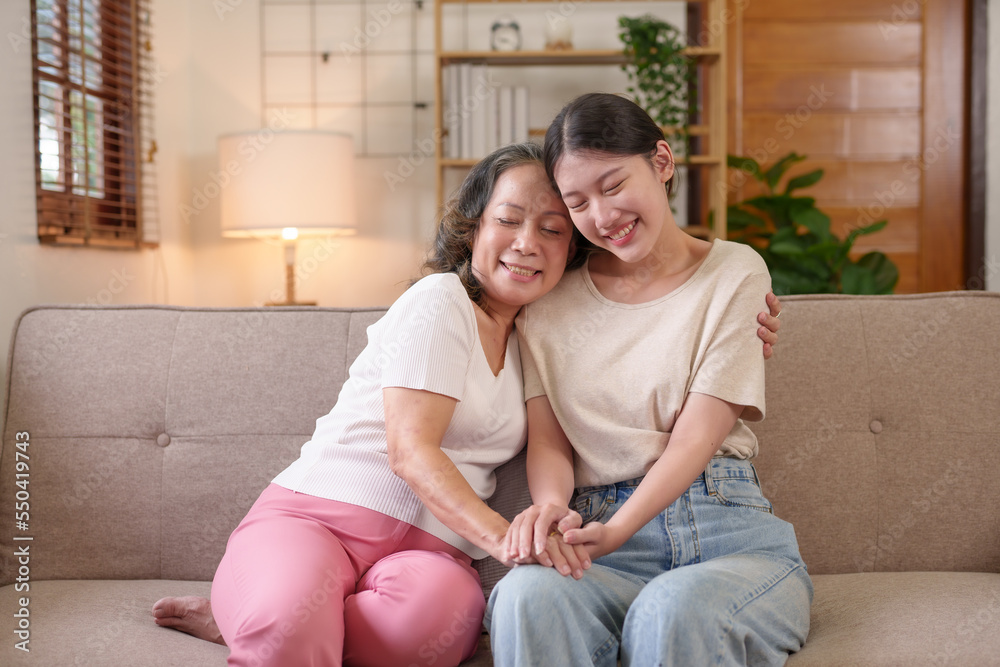 Expression of love between a mother-daughter who takes care of each other, a mother-daughter Asian woman who spends her vacation in the living room happily and warmly expressing her love at home.