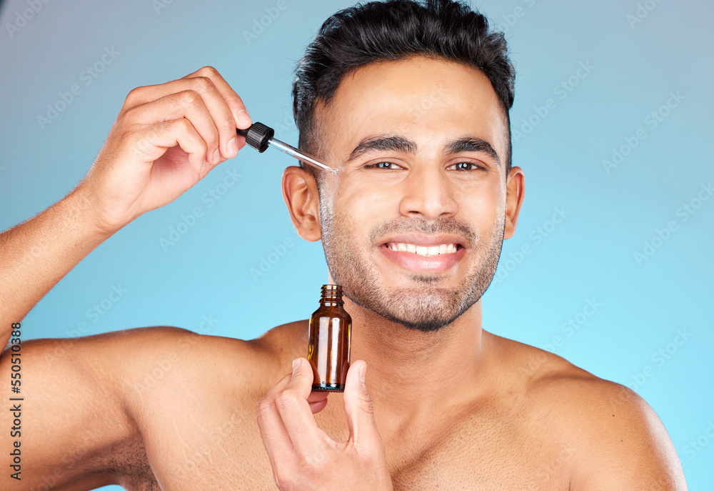 Skincare, health and portrait of man with serum on face for anti aging and glowing skin on blue background. Beauty, facial and male model with smile and collagen oil product in pipette for treatment.