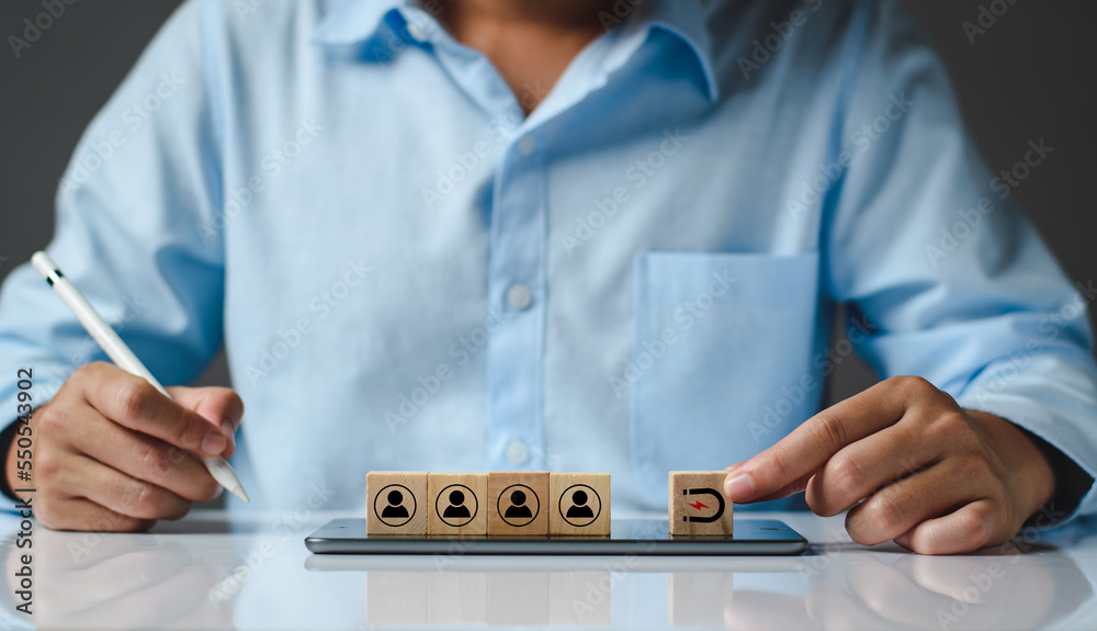 Inbound marketing strategy, customer retention, digital marketing and attracting potential customers in business concept. Wooden cubes with magnet icon attracts the customer icons. Business strategy.