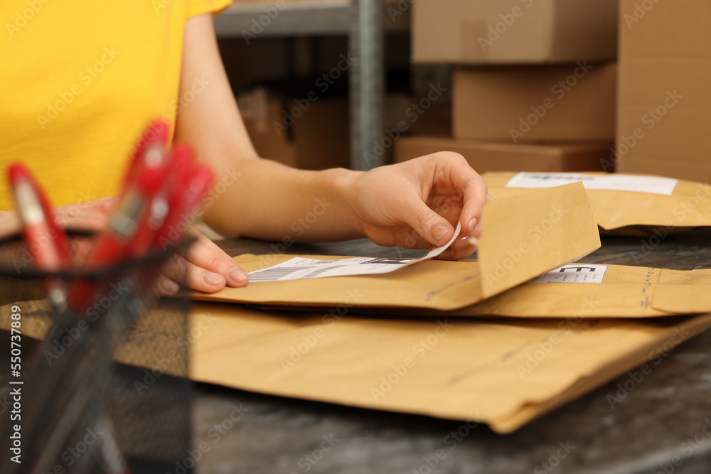 Post office worker sticking barcode on parcel at counter indoors, closeup