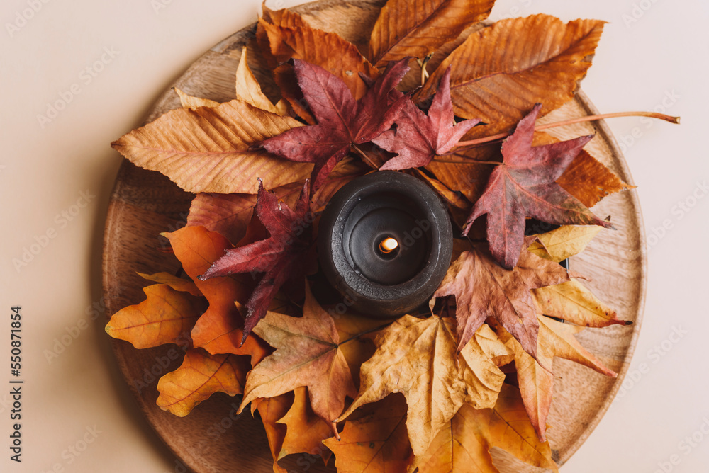 Black candle and colorful autumn leaves on a wooden tray. Home interior element. Top view, flat lay