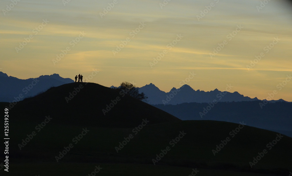 Muscular climber man in protective helmet abseiling from cliff rock wall using rope Belay device and climbing harness on evening sunset sky background. Active extreme sports time spending concept.