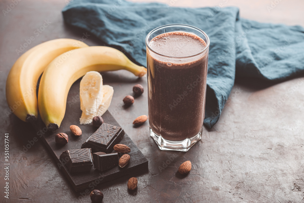 Chocolate milkshake smoothie with banana, protein and nuts on dark background