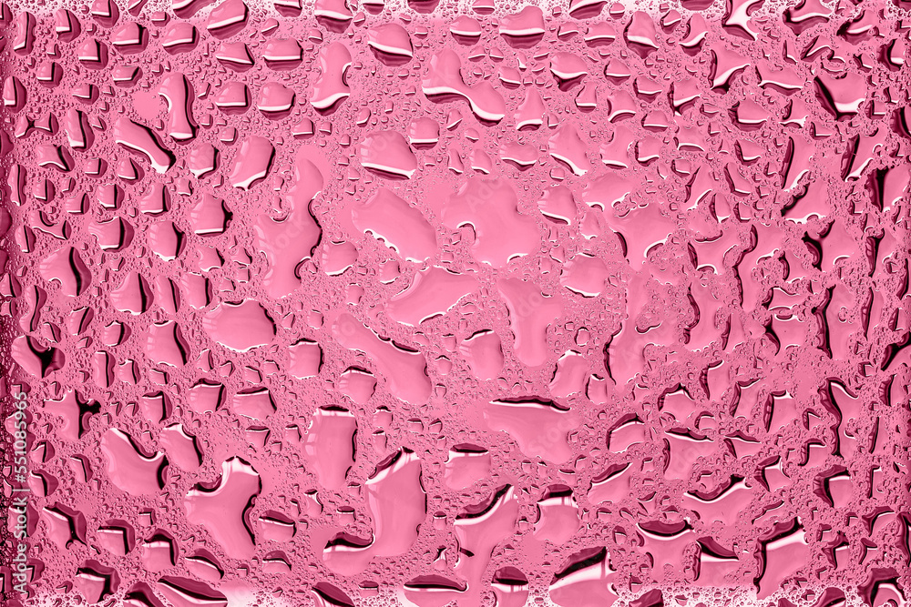 Rain drops on wet transparent glass, abstract background, trendy Magenta color