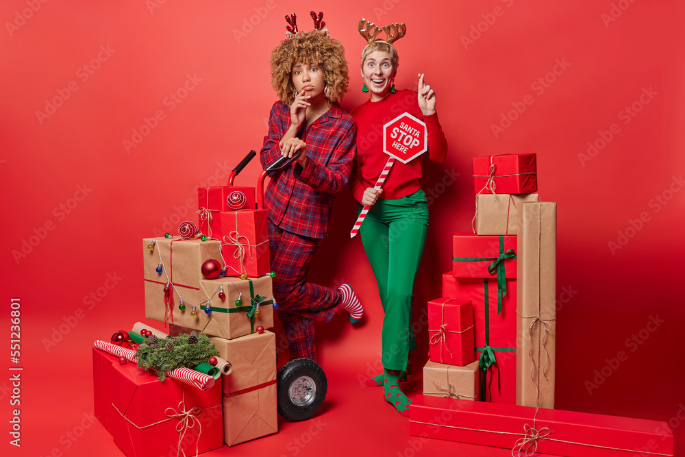 Happy winter holidays concept. Two women stand next to each other keep fingers crossed make wish stand around pile of gift boxes prepare for Christmas celebration stand in full length against red wall