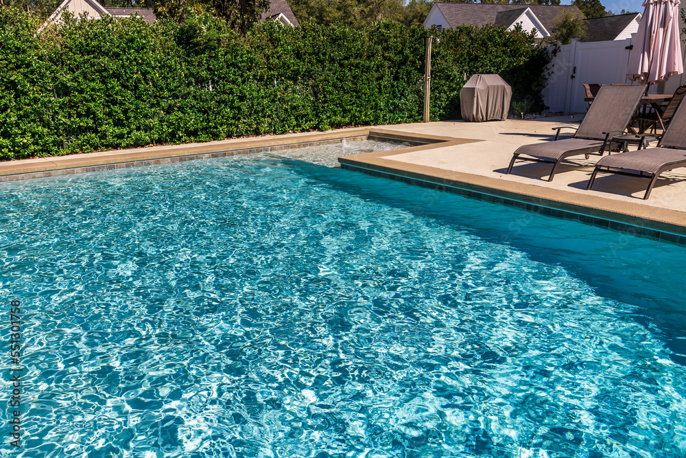 A rectangular new swimming pool with tan concrete edges in the fenced backyard of a new construction house